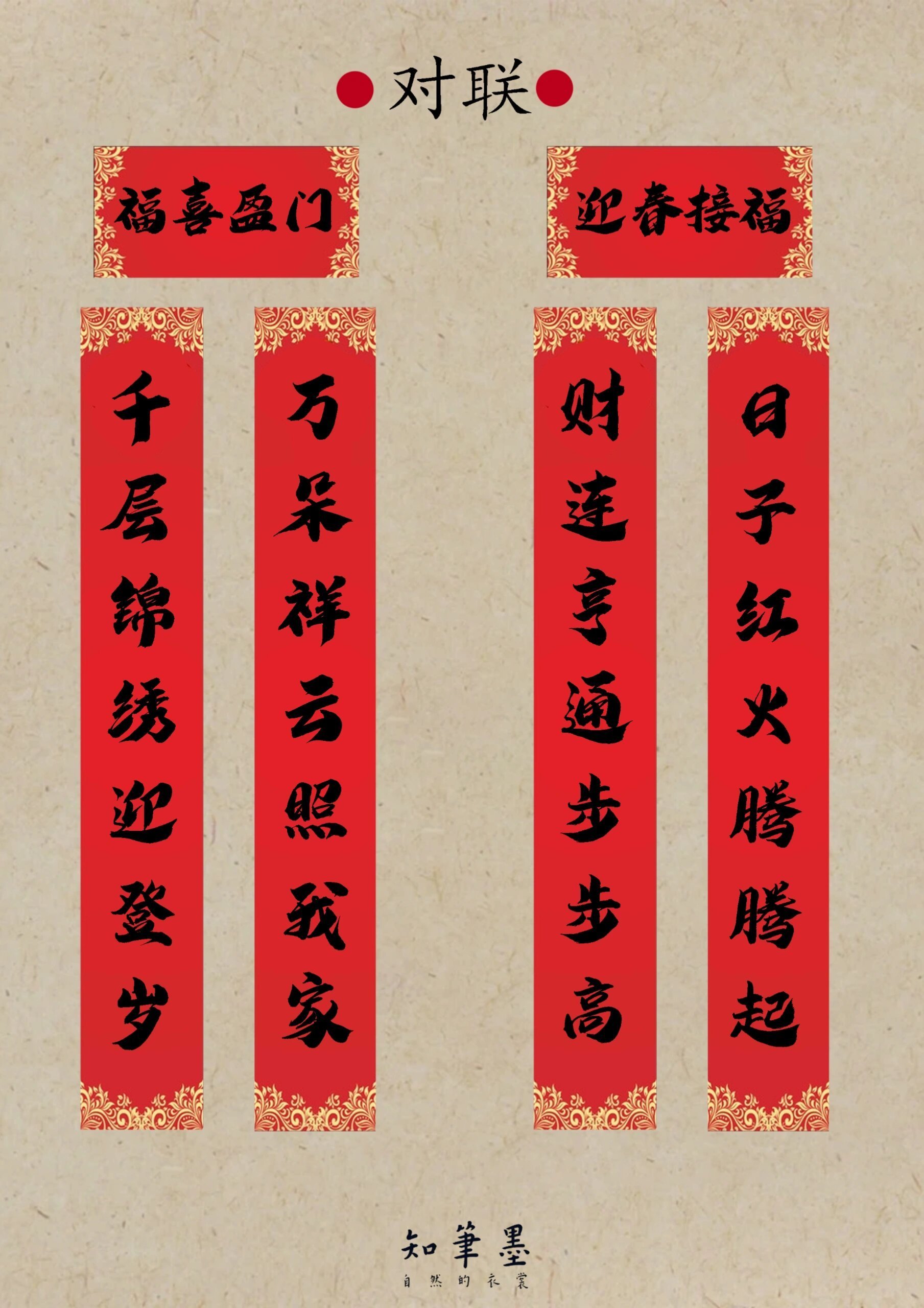 在新年的鐘聲敲響之際,小明突發(fā)奇想,揮毫潑墨創(chuàng)作了新的對聯(lián):“迎新春福旺財旺運(yùn)道旺,接鴻運(yùn)吉祥如意萬事順”,小杰贊嘆不已,也加入了對聯(lián)的創(chuàng)作,這些對聯(lián)在朋友圈傳開,大家都被小明的創(chuàng)意和小杰的才華所折服。